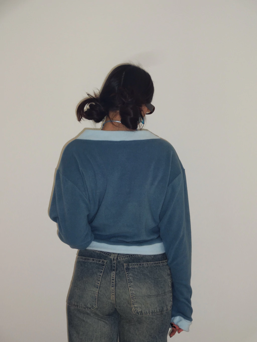 Buzo estilo "cardigan" de micropolar en combinación de colores celeste y azul. Con cuello en V y bordado en el delantero. Disponible en 2 talles.