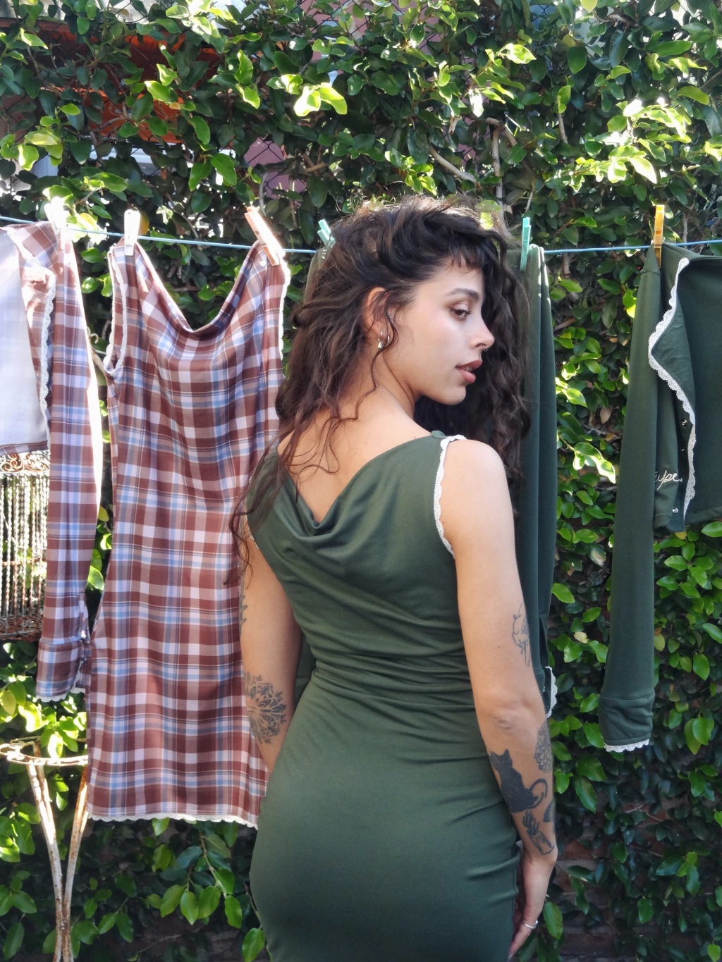 Vestido de modal verde y bordado de Ketupé. Con cuello bote y puntilla broderie. Disponible en talle S-M-L